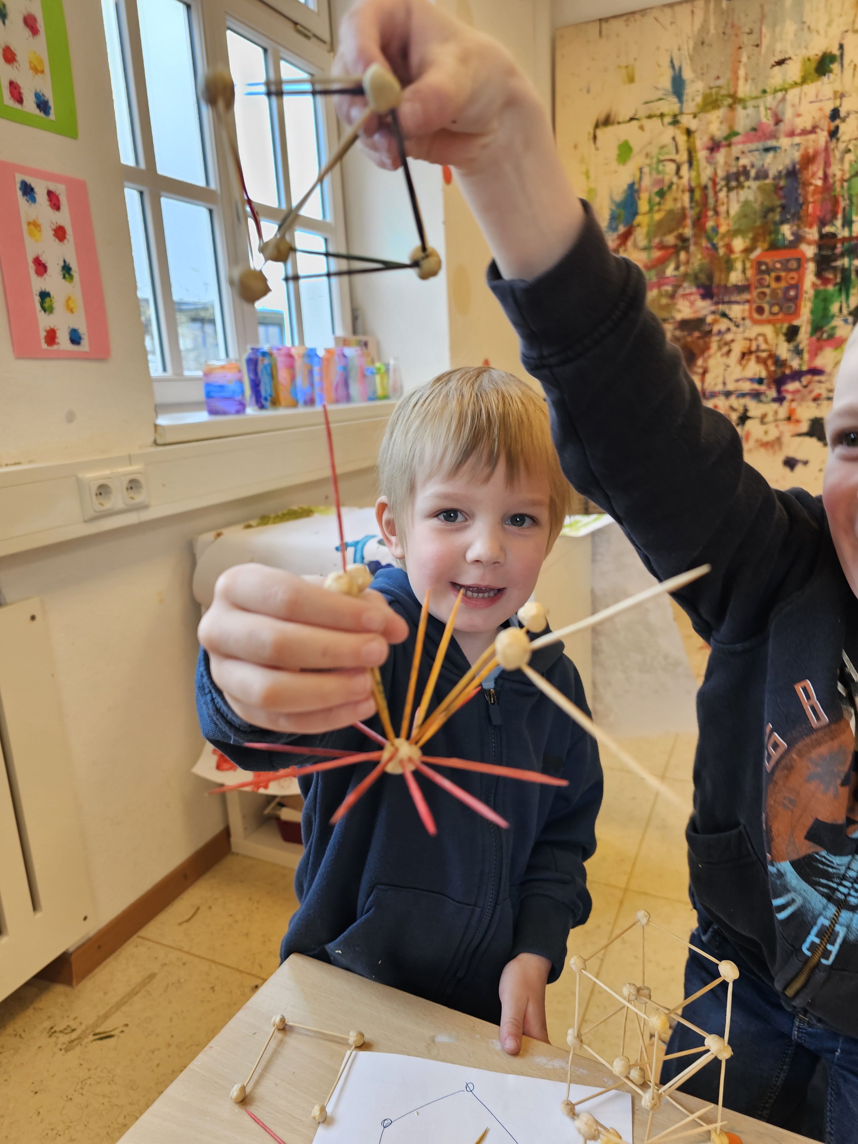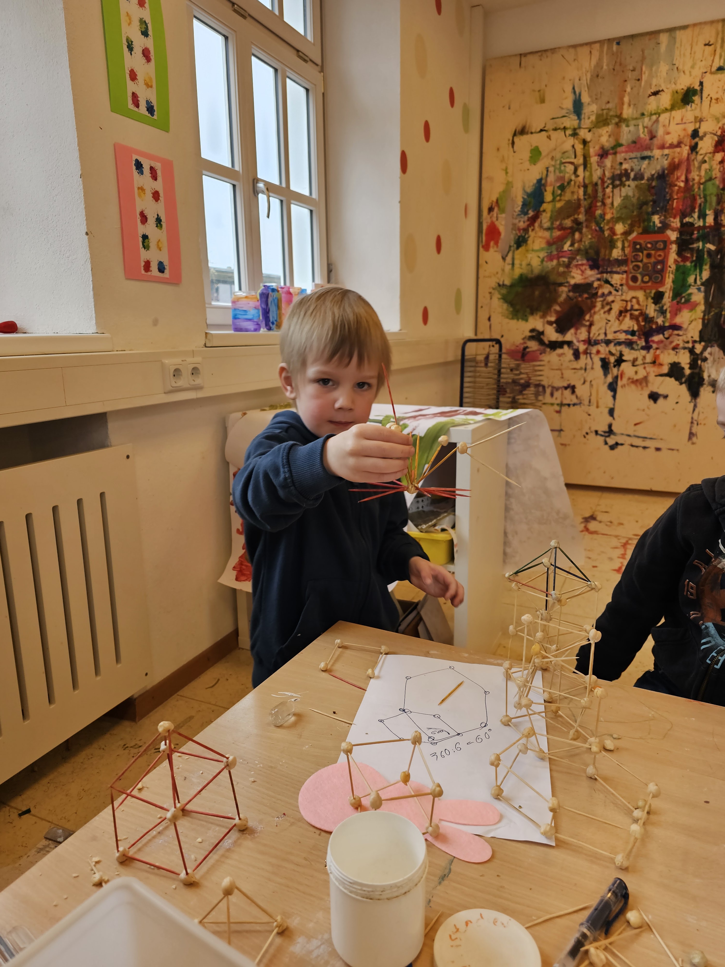 Er stellte ihnen Kristallsysteme vor. Modelle von Kristallsystemen wurden danach gemeinsam aus eingeweichten Kichererbsen und Zahnstocher gebastelt. Die entstehenden Gitter-Formen eignen sich gut um Kristallstrukturen abzubilden.
