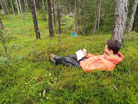 Der Vormittag steht ganz im Zeichen der Sinneswahrnehmung. Nach einem Namenswettlauf zur Aufwärmung gilt es beim Waldmemory, sich möglichst viele Naturgegenstände zu merken und in der nahen Umgebung wiederzufinden. Diese werden anschließend besprochen und von der Gruppe zu einem Mandala aufgelegt – ein biologisch abbaubares Naturkunstwerk, in konzentrischen Kreisen angeordnet. Der anschließende Tarnpfad erfordert höchste Konzentration, um so viele getarnte Kunststofftierchen wie möglich in der Vegetation zu erspähen. „Ohren auf!“ heißt es bei der Geräuschelandkarte. Während einer meditativ anmutenden Ruhephase werden alle wahrgenommenen Geräusche auf einem Stück Papier vermerkt – eine Einladung, einmal genauer als üblich hinzuhören. Außerdem eine ideale Vorbereitung für die nächsten Aktivitäten, bei der eine Person im Zweierteam die andere mit verbundenen Augen führt – und das sogar weitgehend kontaktlos! Zuerst geht es darum, einen ertasteten Baum im Anschluss mit offenen Augen unter vielen wiederzuerkennen. Anschließend führt ein Fotograf seine menschliche Kamera spazieren und stellt sie auf verschiedene Naturschnappschüsse ein. Das Erlebte wird in der Gruppe reflektiert und die Eignung verschiedener Methoden in unterschiedlichen Kontexten diskutiert.