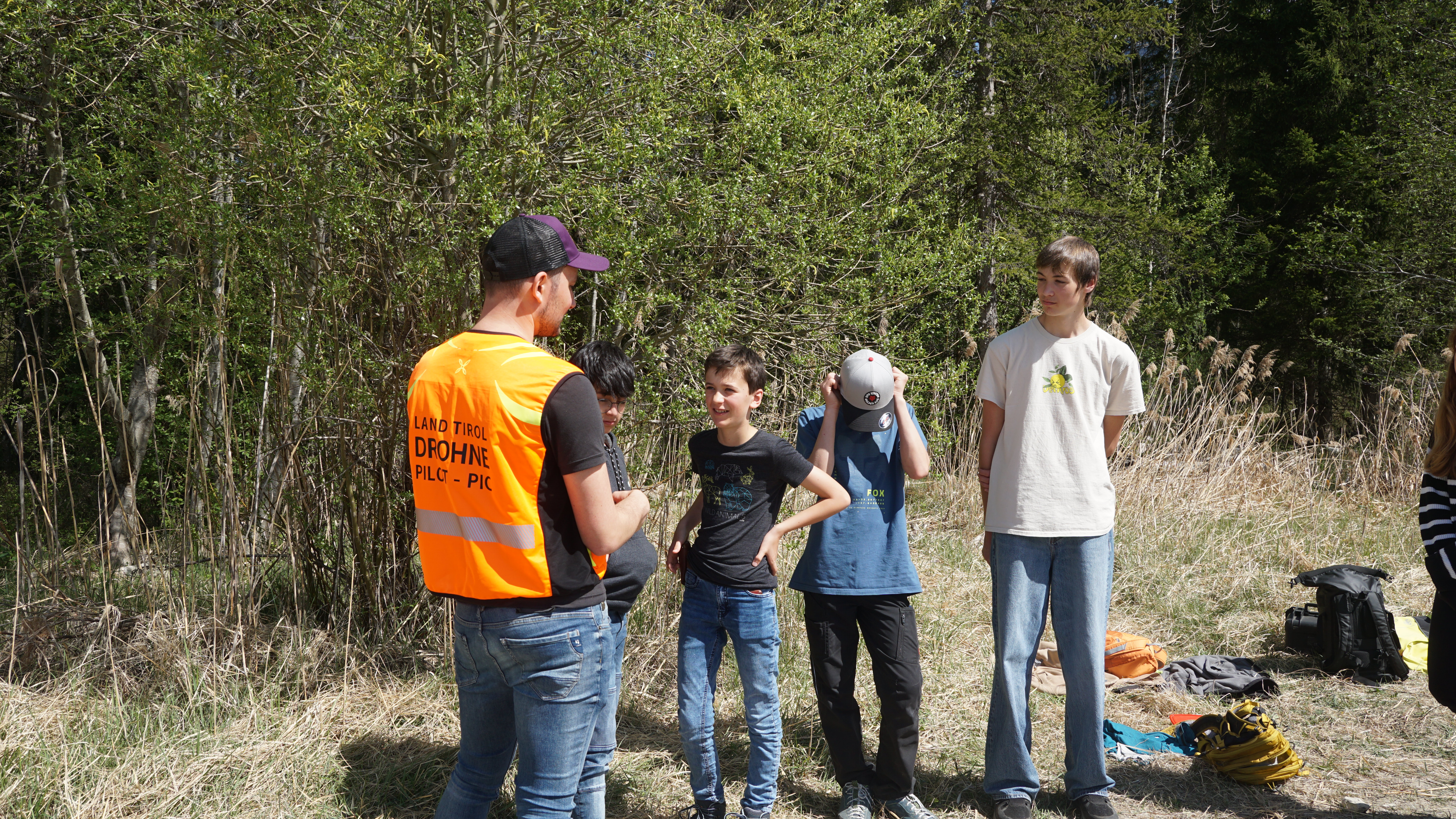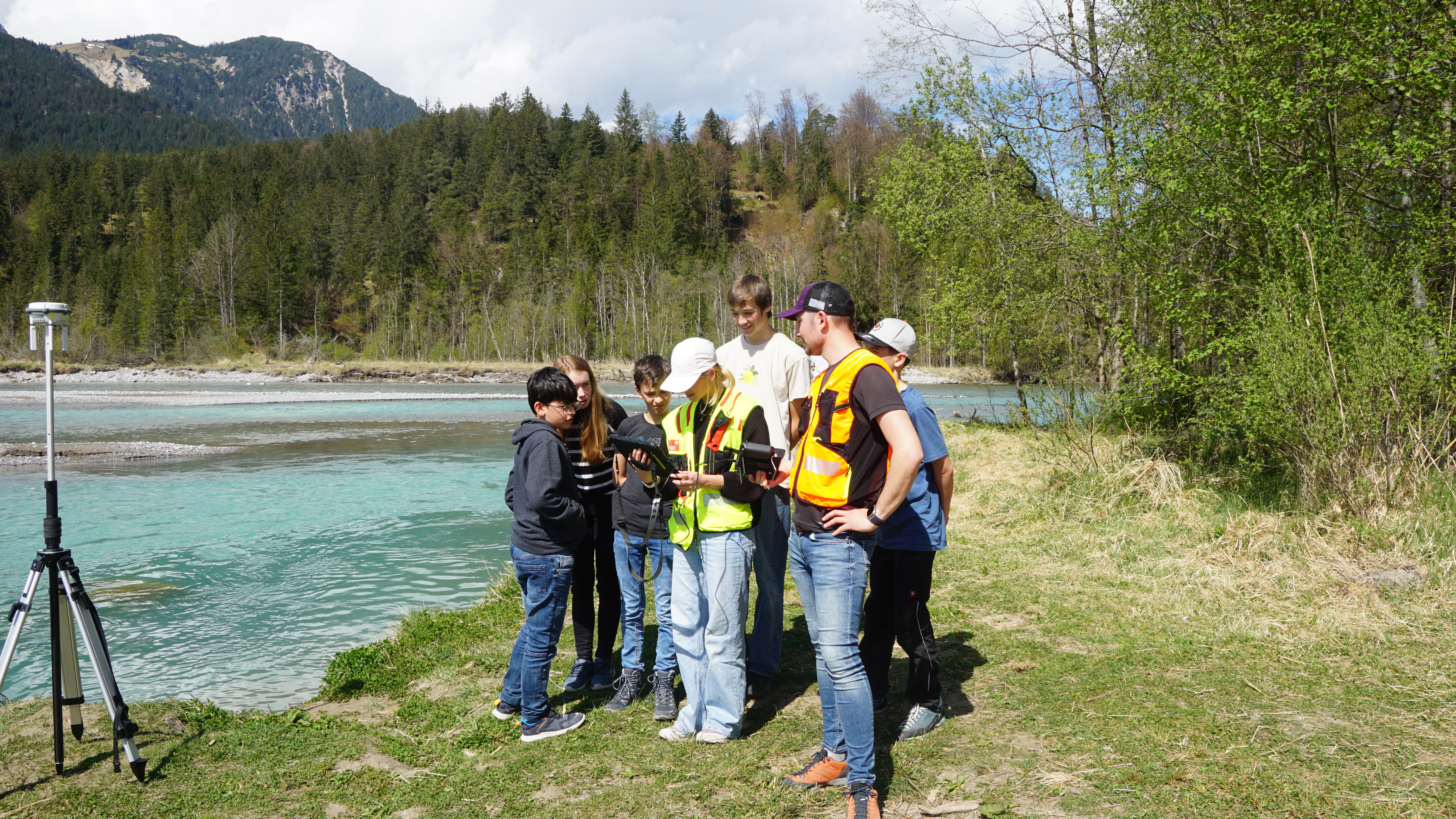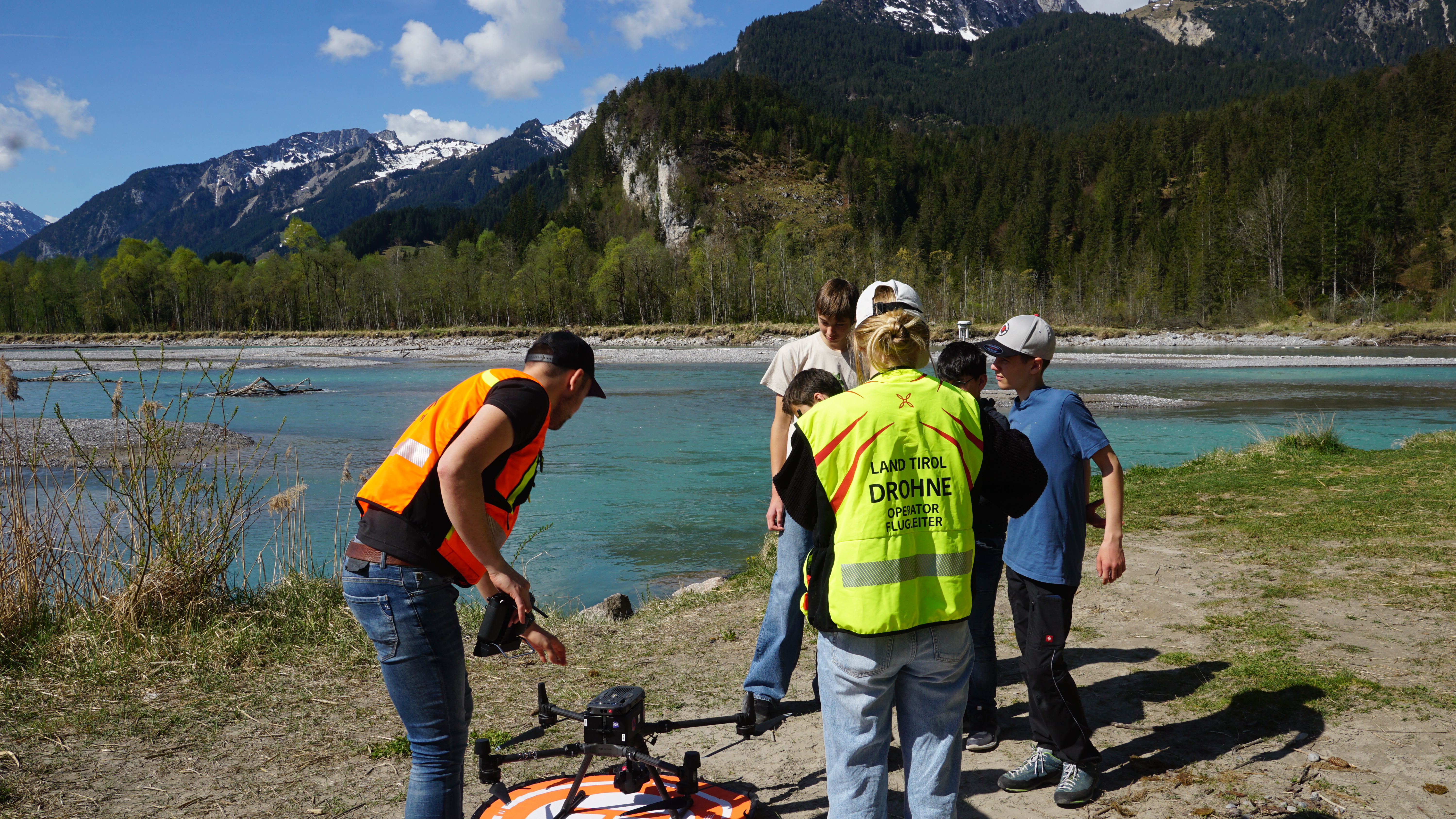 Eine Kleingruppe vom Gym Reutte trifft sich am 23. April 2025 mit Benedikt Englmeier von der Abteilung Leitstellenwesen und Landeswarnzentrale, Land Tirol. Mit seinen Drohnenaufnahmen ermöglichte er einerseits einen spektakulären Einblick in die Arbeit der Landeswarnzentrale, andererseits ein aktuelles Orthofoto eines Abschnitts des Lechs fürs Forschungsprojekt der Schüler.