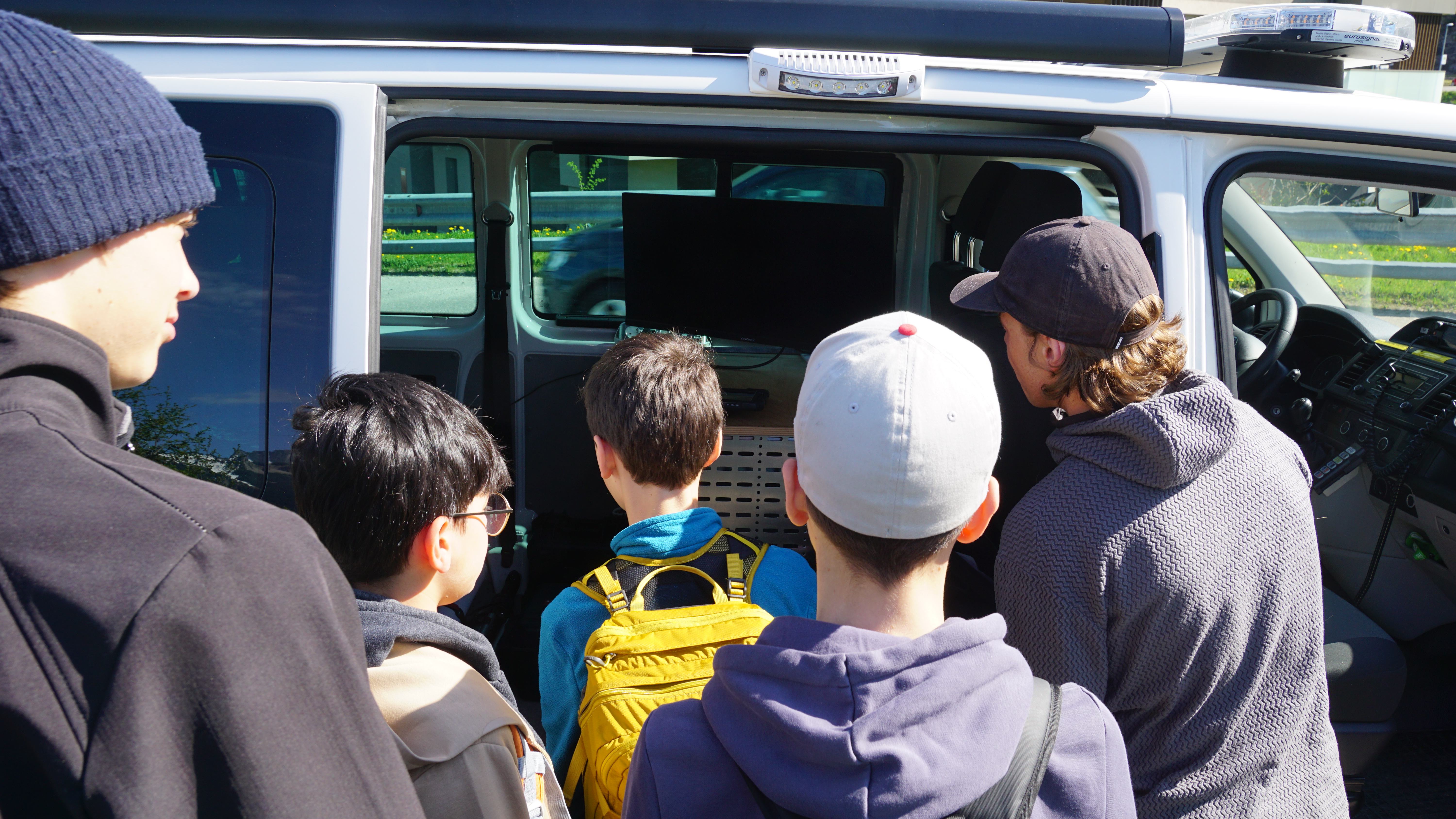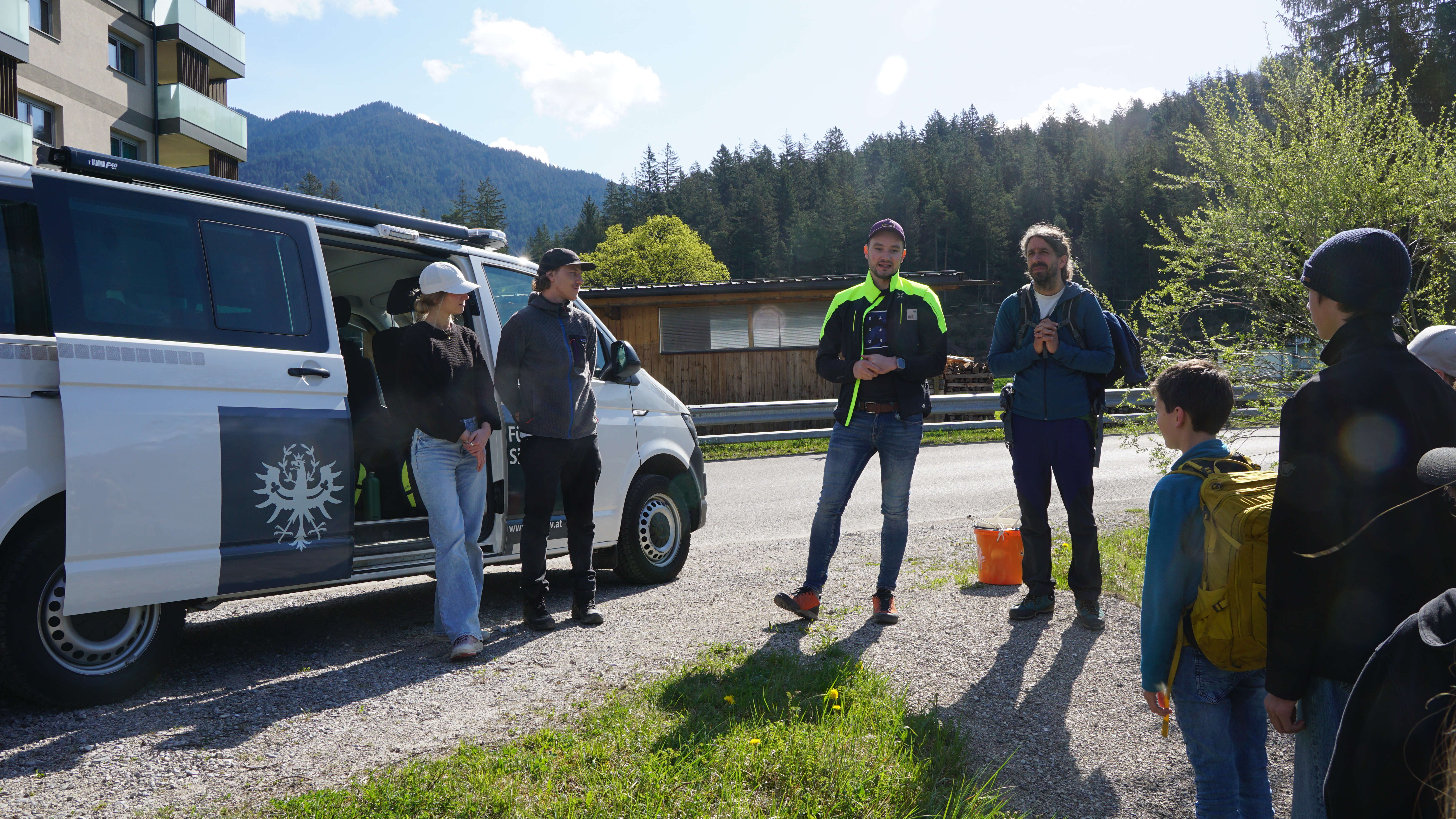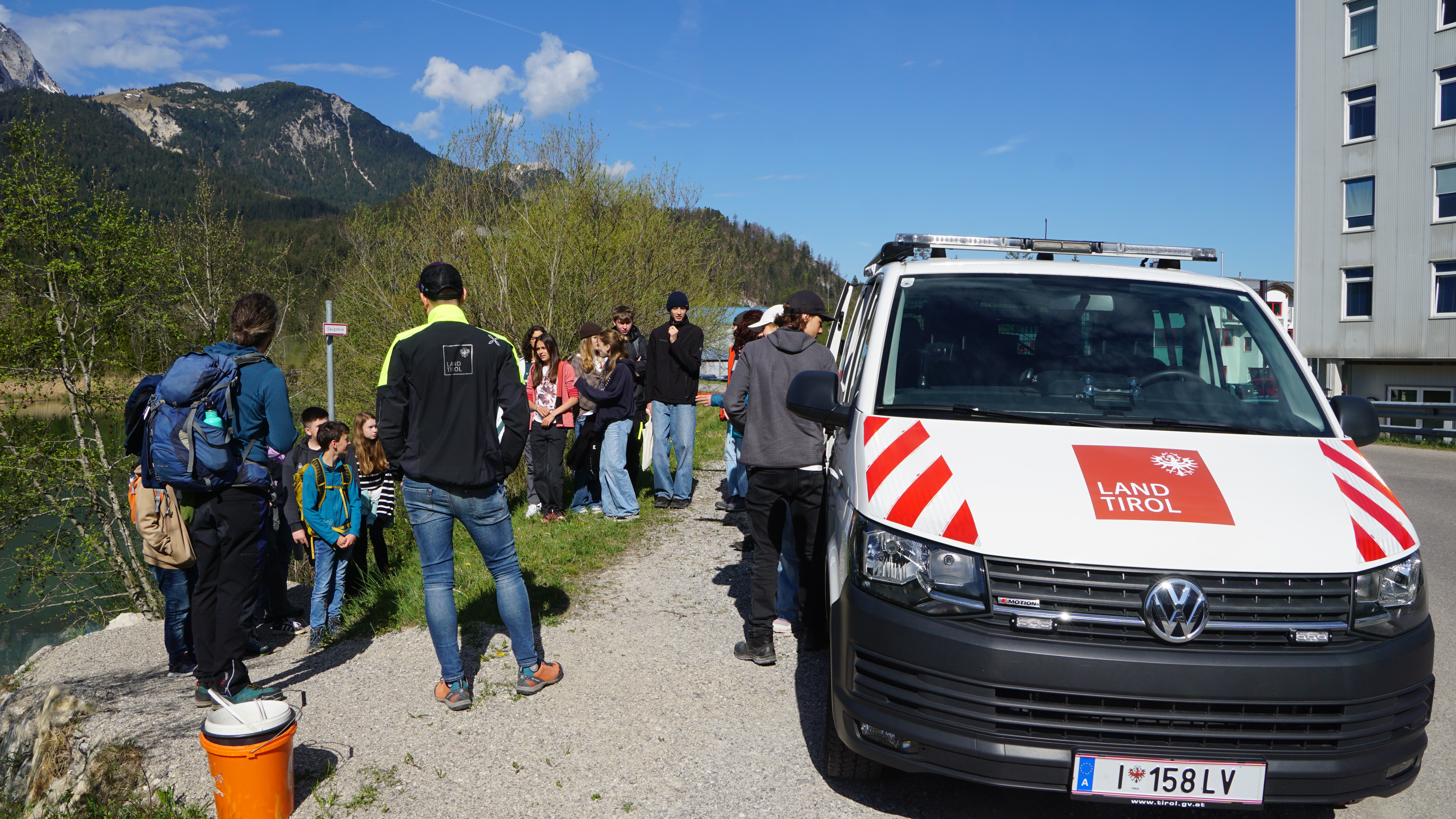Eine Kleingruppe vom Gym Reutte trifft sich am 23. April 2025 mit Benedikt Englmeier von der Abteilung Leitstellenwesen und Landeswarnzentrale, Land Tirol. Mit seinen Drohnenaufnahmen ermöglichte er einerseits einen spektakulären Einblick in die Arbeit der Landeswarnzentrale, andererseits ein aktuelles Orthofoto eines Abschnitts des Lechs fürs Forschungsprojekt der Schüler.
