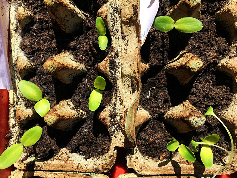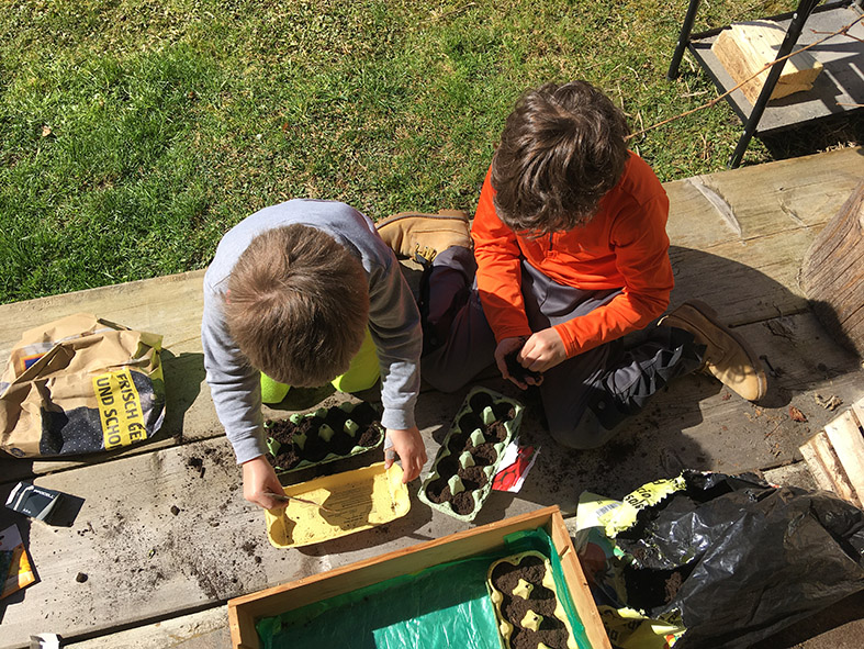 Endlich habe ich sowohl Grund als auch Zeit, um Gemüse zu säen! Jeden Morgen schauen wir, ob aus der Erde schon zarte Blättchen von Karotten, Radieschen, Gurke und Kohlrabi wachsen. Das junge Gemüse verbringt seine Kindheit bei uns in der Stube, bevor es dann im Mai ins Hochbeet gepflanzt wird. Ideal sind Eierschachteln zum vorziehen, die können auch mit ins Beet gesetzt werden.