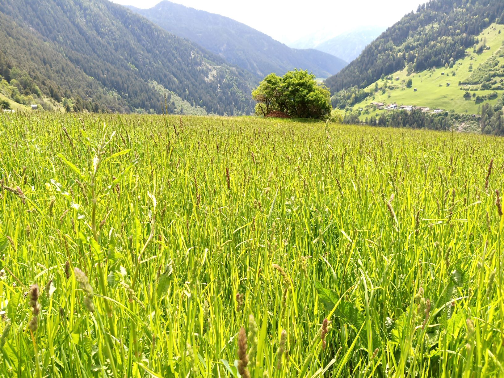 Der nächste Stopp führt dann gleich eindrucksvoll vor Augen, dass auch Wiese nicht gleich Wiese ist. Der Güterweg, auf dem wir durch die Wiesen spazieren, trennt die Flächen zweier verschiedener Grundeigentümer, welche offensichtlich nach unterschiedlichen Kriterien wirtschaften. Zu unserer Linken blicken wir auf eine blumen- und farbenreiche Magerwiese mit Arten wie dem Wiesen-Salbei (Salvia pratensis), der Magerwiesen-Margerite (Leucanthemum vulgare), dem Taubenkropf-Leimkraut (Silene vulgaris) und der Saat-Esparsette (Onobrychis viciifolia). Zu unserer Rechten hingegen prägen wenige konkurrenzstarke, aber auch störungsresistente ruderale Arten wie das Weiße Labkraut (Galium album) und die Gewöhnliche Wiesen-Schafgarbe (Achillea millefolium) das Bild – ein Anzeiger einerseits dafür, dass hier durch Düngung das Wasser- und Nahrstoffregime stark verändert wurde, und andererseits, dass hier vor nicht allzu langer Zeit ein Umbruch passiert ist. Den Walliser Schwingel (Festuca valesiaca), eine Leitart der inneralpinen Trockengebiete, finden wir nur auf dem gar nicht gedüngten und trockenen Böschungsrand der Wiese, wie auch den Feld-Thymian (Thymus pulegioides) und den Milden Mauerpfeffer (Sedum sexangulare). Diese Arten sind nicht konkurrenzstark und haben bei guter Wasser- und Nährstoffversorgung gegen Löwenzahn und Co. keine Chance – auf schwierigeren Standorten hingegen kommt ihnen ihre ausgesprochene Stresstoleranz zugute.