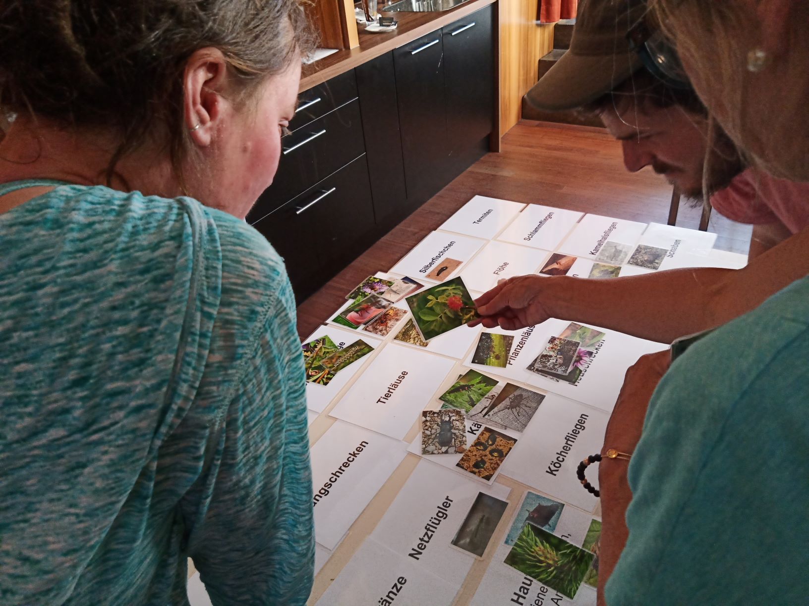 Am Nachmittag werden die wichtigsten Insektenordnungen und ihre Merkmale drinnen vertiefend besprochen. Beim anschließenden Quiz werden unbeschriftete Fotos von Insekten sytematisch zugeteilt. Doch wie ein guter Zauberer hat sich Kurt für den Abschluss des Insektenmarathons einen ganz besonderen Höhepunkt aufbewahrt. Aus Kartons und Kisten lässt er lebende Individuen tropischer Rieseninsekten aus seiner Sammlung krabbeln, freiwillige TeilnehmerInnen können sich auch selbst als temporärer Ast für die Malaiische Riesengespenstschrecke oder Dschungelnymphe (Heteropteryx dilatata), die erst seit 1995 bekannte einzige Gespenstschreckenart ihrer Gattung Sungaya inexpectata und das Wandelnde Blatt (Phyllium sp.) zur Verfügung stellen – Gänsehaut garantiert!
