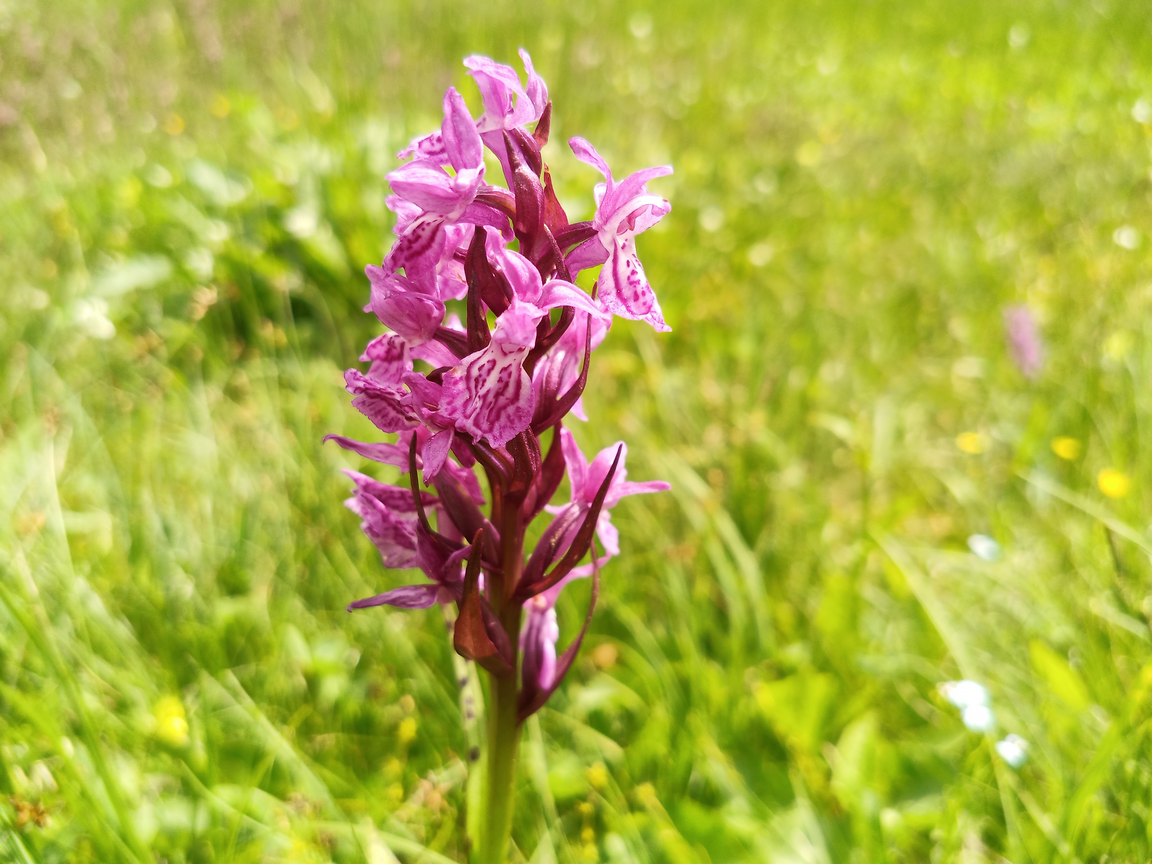 Bei den Mähwiesen in Dorfnähe wurde der erste Schnitt schon getätigt, und die Heulader bingen die Ernte in die Scheunen. Einige moderne Bewässerungsanlagen deuten auch hier auf eine Intensivierung der landwirtschaftlichen Tätigkeit hin. Diese steigert zwar die Produktion pro Fläche, allerdings werden trockenheitstolerante Spezialisten unter den Pflanzen und die mit ihnen assoziierten seltenen Insektenarten so von den Flächen verdrängt. Trotzdem stoßen wir an vielen Stellen noch auf Magerkeitszeiger wie den Wiesen-Salbei, die Magerwiesen-Margerite oder das Zittergras. Weiter oben am Berg wird an einem Hangmoor deutlich, dass nicht nur Trockenheit biologisch interessante Sonderstandorte schafft. Aus dem von Wollgräsern dominierten Wiesenabschnitt leuchten verschiedene Knabenkräuter. Aus der farbenprächtigen Mähwiese nebenan nehmen wir gleich einen Strauß Blütenpflanzen für die Bestimmungsübung mit. Mit Hilfe von Lupen und einfacher Bestimmungsliteratur erarbeiten sich die Teilnehmer:innen nach und nach Wiesen-Bocksbart, Wundklee, Vogelwicke, Schafgarbe, Bittersüßen Nachtschatten, Weidenblättriges Ochsenauge und viele mehr. Auch seltenere Spezialisten wie der Schild-Ampfer, die Traubige Graslilie und die Karthäuser-Nelke werden punktgenau bestimmt.